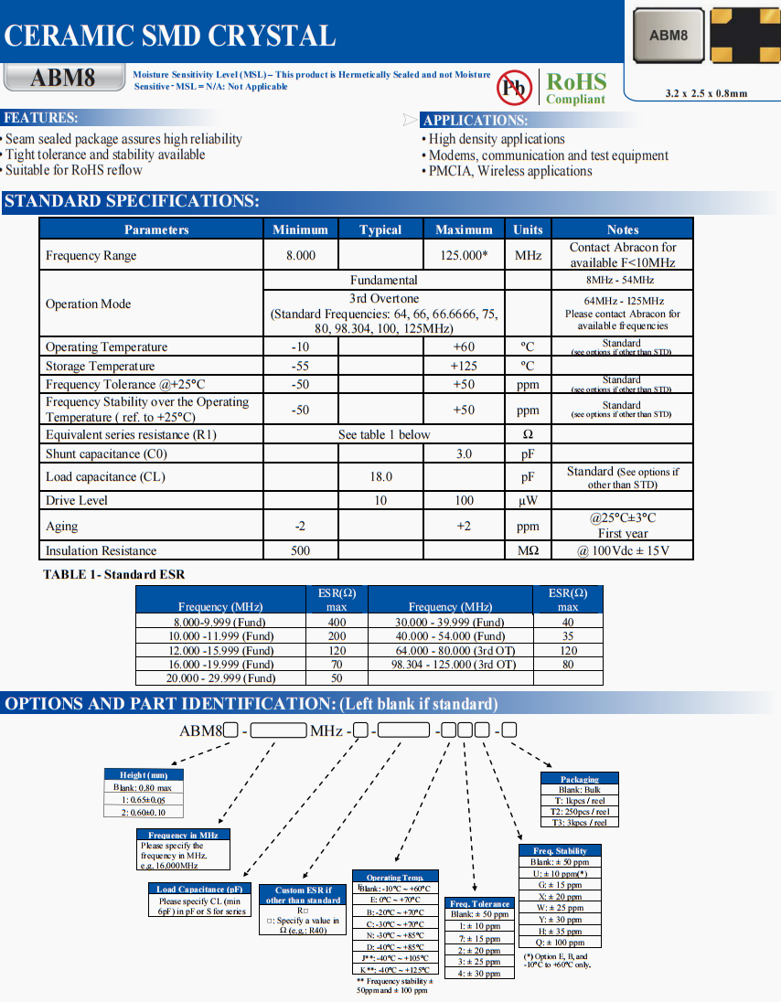| ABM8-18.432MHZ-B2-T | Abracon | ABM8 | 18.432 MHz | ±50ppm | ±20ppm | 18 pF |