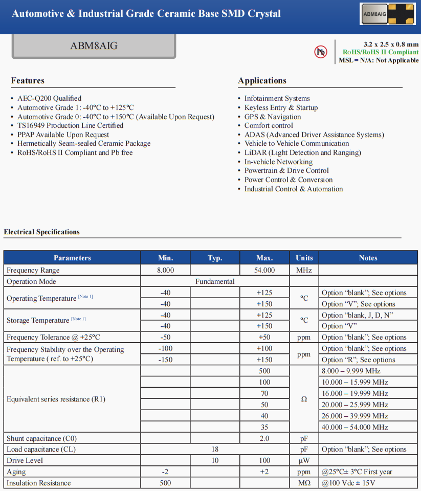 ABM8AIG-12.288MHZ-12-2-T3進口晶振,Abracon進口3225晶振,ABM8AIG汽車動力總成晶振,美國Abracon晶振公司,艾博康晶振,ABM8AIG晶振,ABM8AIG-12.288MHZ-12-2-T3晶振,進口晶振,無源晶振,美國晶振,高品質(zhì)晶振,低損耗晶振,高精度晶振,3225晶振,四腳晶振,石英晶體,貼片晶振。AEC-Q200合格,汽車等級1:-40°C至+125°C,汽車等級0:-40°C至+150°C(可根據(jù)要求提供),TS16949生產(chǎn)線認證,PPAP可根據(jù)要求提供,密封密封陶瓷封裝,符合RoHS/RoHS II標準且不含鉛,信息娛樂系統(tǒng),無鑰匙進入和啟動,GPS和導航,舒適控制,ADAS(高級駕駛輔助系統(tǒng)),車對車通信,激光雷達(光探測和測距),車載網(wǎng)絡(luò),動力總成和驅(qū)動控制,電源控制和轉(zhuǎn)換,工業(yè)控制和自動化