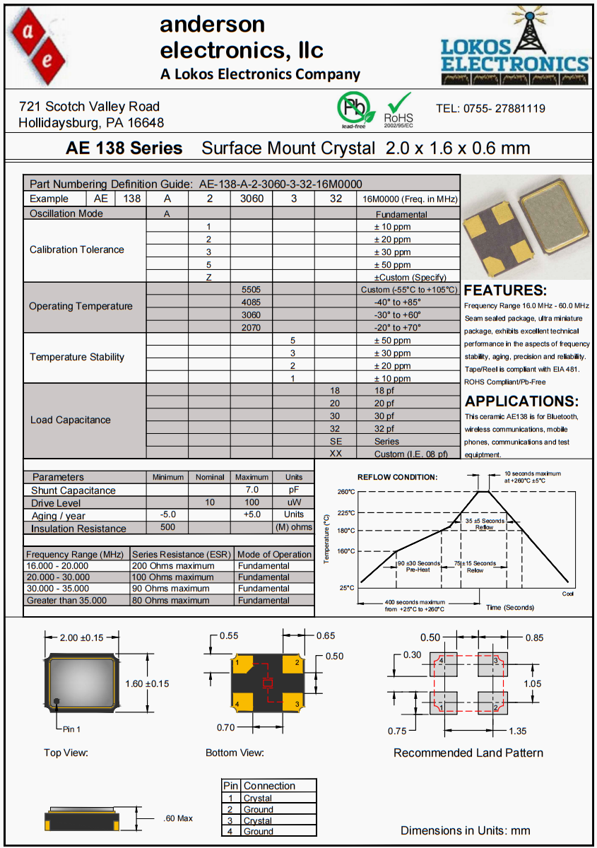 安德森美國晶振,6G信號發射器晶振,AE-138-A-2-3060-3-32-24M0000貼片晶振,美國Anderson晶振公司,安德森晶振,頻率范圍16.0 MHz - 60.0 MHz Seam密封封裝,超小型封裝,在頻率穩定性、老化性、精度和可靠性方面具有優異的技術性能。磁帶/卷軸符合EIA 481標準。該陶瓷AE138適用于藍牙,無線通信,移動電話,通信和測試設備等其他IT產品的晶振應用,三態功能,PC和LCDM等高端數碼領域,符合RoHS/無鉛。進口晶振,AE-138晶振,無源晶振,貼片晶振,超小型晶振,2016晶振,6G通訊設備晶振,6G路由器晶振,6G網絡終端晶振,無源晶振,貼片晶振,無人機晶振,汽車輔助駕駛晶振,低損耗晶振,高品質晶振。