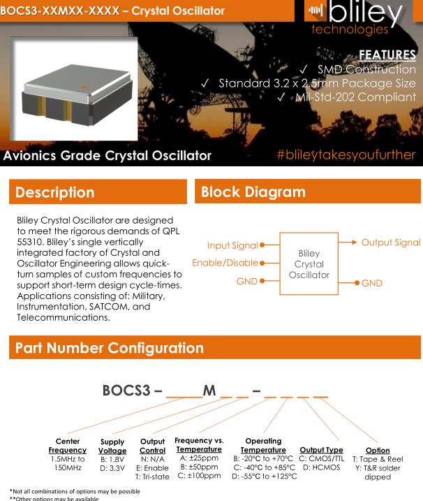 Bliley晶振,BOCS3晶振,BOCS3-24.000MBN-BCCT晶振,小型SMD有源晶振,從最初超大體積到現在的7050mm,6035mm,5032mm,3225mm,2520mm體積,有著翻天覆地的改變,體積的變小也使產品帶來了更高的穩定性能,接縫密封石英晶體振蕩器,精度高,覆蓋頻率范圍寬的特點,SMD高速自動安裝和高溫回流焊設計,Optionable待機輸出三態輸出功能,電源電壓范圍:1.8V~5V,高穩定性,低抖動,低功耗,主要應用領域:無線通訊,高端智能手機,平板筆記本WLAN,藍牙,數碼相機,DSL和其他IT產品的晶振應用,三態功能,PC和LCDM等高端數碼領域,符合RoHS/無鉛.Bliley晶振公司發展歷史: