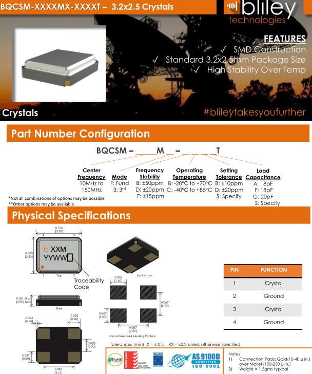 Bliley晶振,BQCSM晶振,BQCSM-20.000M-FDBBAT晶振,超小型表面貼片型SMD晶振,最適合使用在汽車電子領(lǐng)域中,也是特別要求高可靠性的引擎控制用CPU的時鐘部分.低頻晶振可從7.98MHz起對應(yīng),小型,超薄型具備強防焊裂性,石英晶體在極端嚴酷的環(huán)境條件下也能發(fā)揮穩(wěn)定的起振特性,產(chǎn)品本身具有耐熱,耐振,耐撞擊等優(yōu)良的耐環(huán)境特性,滿足無鉛焊接以及高溫回流溫度曲線要求,符合AEC-Q200標準.Bliley Technologies Inc. 最初于 1930 年作為 Bliley Piezo-Electric Company 成立。最初,我們?yōu)闃I(yè)余無線電市場制造石英晶體。在 1930 年代中期,我們的客戶和產(chǎn)品很快擴大到與新興的軍事和商業(yè)通信領(lǐng)域的利益相匹配,我們的名稱更名為 Bliley Electric Company。1939 年,我們是最大的水晶公司,擁有 11 名員工。