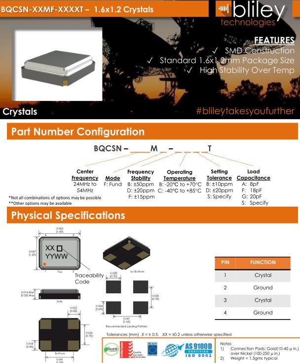 Bliley晶振,BQCSN晶振,BQCSN-24.000M-FFCDST晶振,貼片晶振本身體積小,超薄型石英晶體振蕩器,特別適用于有目前高速發(fā)展的高端電子數(shù)碼產(chǎn)品,因?yàn)榫д癖旧硇⌒突枨蟮氖袌?chǎng)領(lǐng)域,小型,薄型是對(duì)應(yīng)陶瓷振蕩器(偏差大)和普通的石英晶體振蕩器(偏差小)的中間領(lǐng)域的一種性價(jià)比較出色的產(chǎn)品.產(chǎn)品廣泛用于筆記本電腦,無線電話,衛(wèi)星導(dǎo)航SSD,USB,Blu-ray等用途,符合無鉛焊接的高溫回流焊曲線特性.Bliley Technologies Inc. 最初于 1930 年作為 Bliley Piezo-Electric Company 成立。最初,我們?yōu)闃I(yè)余無線電市場(chǎng)制造石英晶體。在 1930 年代中期,我們的客戶和產(chǎn)品很快擴(kuò)大到與新興的軍事和商業(yè)通信領(lǐng)域的利益相匹配,我們的名稱更名為 Bliley Electric Company。1939 年,我們是最大的水晶公司,擁有 11 名員工。