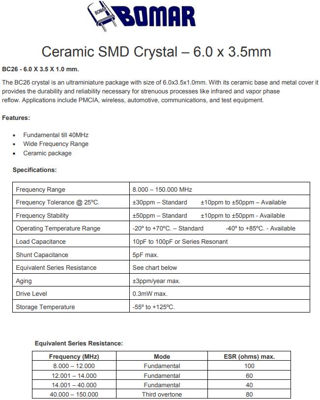 Bomar晶振,B1325-AAAS3T-10.000000晶振,SMD振蕩器,有源晶振,是指晶體本身起振需要外部電壓供應(yīng),起振后可直接驅(qū)動(dòng)CMOS集成電路,產(chǎn)品本身已實(shí)現(xiàn)與薄型IC(TSSOP封裝,TVSOP封裝)同樣的1mm厚度,斷開時(shí)的消費(fèi)電流是15µA以下,編帶包裝方式可對(duì)應(yīng)自動(dòng)搭載及IR回流焊接(無鉛對(duì)應(yīng))產(chǎn)品有幾種電壓供選1.8V,2.5V,3V3.3V,5V,以應(yīng)對(duì)不同IC產(chǎn)品需要..Bomar成立于 1963 年,是一家為商業(yè)和雙向無線電行業(yè)生產(chǎn)石英晶體的制造商。該業(yè)務(wù)的性質(zhì)要求在寬頻率范圍內(nèi)具有嚴(yán)格的容差和高穩(wěn)定性晶體,以滿足嚴(yán)格的 FCC 規(guī)范。快速生產(chǎn)的需求對(duì)我們不斷增長的客戶群很重要。我們的許多客戶都是當(dāng)?shù)亍⒅莺吐?lián)邦警察和監(jiān)視機(jī)構(gòu)。Bomar 很快不僅成為該市場的領(lǐng)先供應(yīng)商,而且因其產(chǎn)品質(zhì)量、快速周轉(zhuǎn)時(shí)間和無與倫比的客戶服務(wù)而獲得一致認(rèn)可。