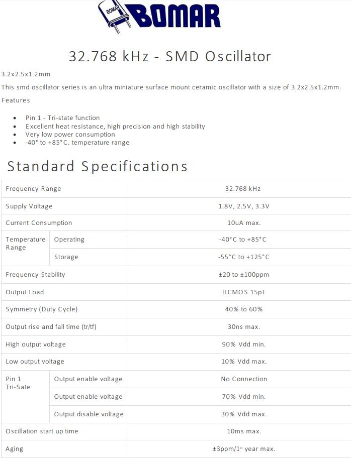 Bomar晶振,B1350-AEBS3T-32.768kHz晶振,高品質晶振,小型SMD有源晶振,從最初超大體積到現在的7050mm,6035mm,5032mm,3225mm,2520mm體積,有著翻天覆地的改變,體積的變小也使產品帶來了更高的穩定性能,接縫密封石英晶體振蕩器,精度高,覆蓋頻率范圍寬的特點,SMD高速自動安裝和高溫回流焊設計,Optionable待機輸出三態輸出功能,電源電壓范圍:1.8V~5V,高穩定性,低抖動,低功耗,主要應用領域:無線通訊,高端智能手機,平板筆記本WLAN,藍牙,數碼相機,DSL和其他IT產品的晶振應用,三態功能,PC和LCDM等高端數碼領域,符合RoHS/無鉛.Bomar成立于 1963 年,是一家為商業和雙向無線電行業生產石英晶體的制造商。該業務的性質要求在寬頻率范圍內具有嚴格的容差和高穩定性晶體,以滿足嚴格的 FCC 規范。快速生產的需求對我們不斷增長的客戶群很重要。我們的許多客戶都是當地、州和聯邦警察和監視機構。Bomar 很快不僅成為該市場的領先供應商,而且因其產品質量、快速周轉時間和無與倫比的客戶服務而獲得一致認可。