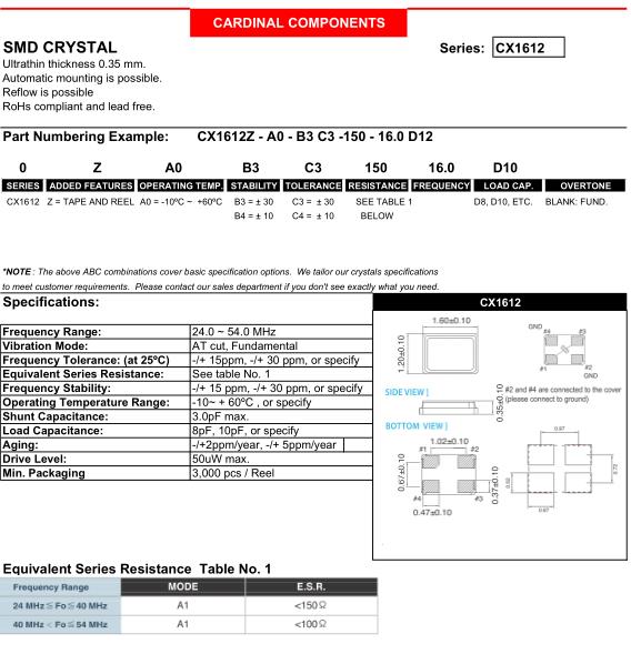 | Cardinal晶振規格 | 單位 | CX1612晶振頻率范圍 | 石英晶振基本條件 |
