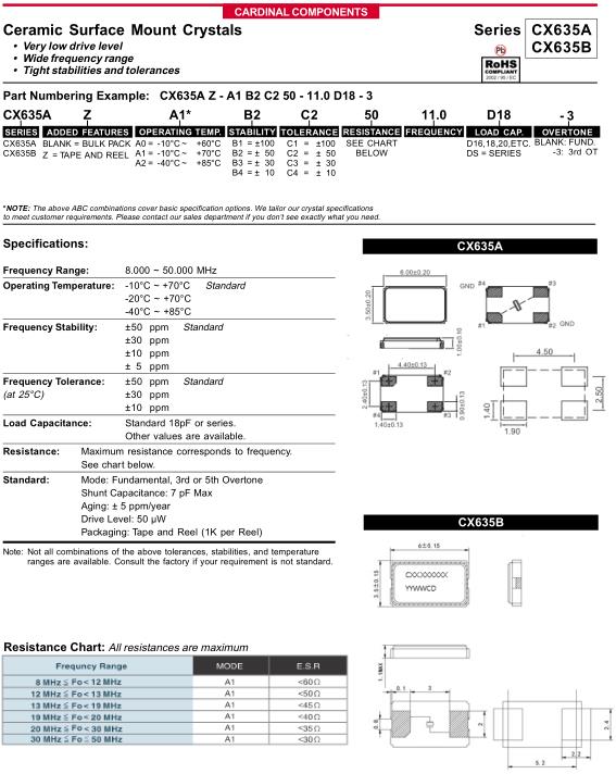 | Cardinal晶振規格 | 單位 | CX635A/CX635B晶振頻率范圍 | 石英晶振基本條件 |