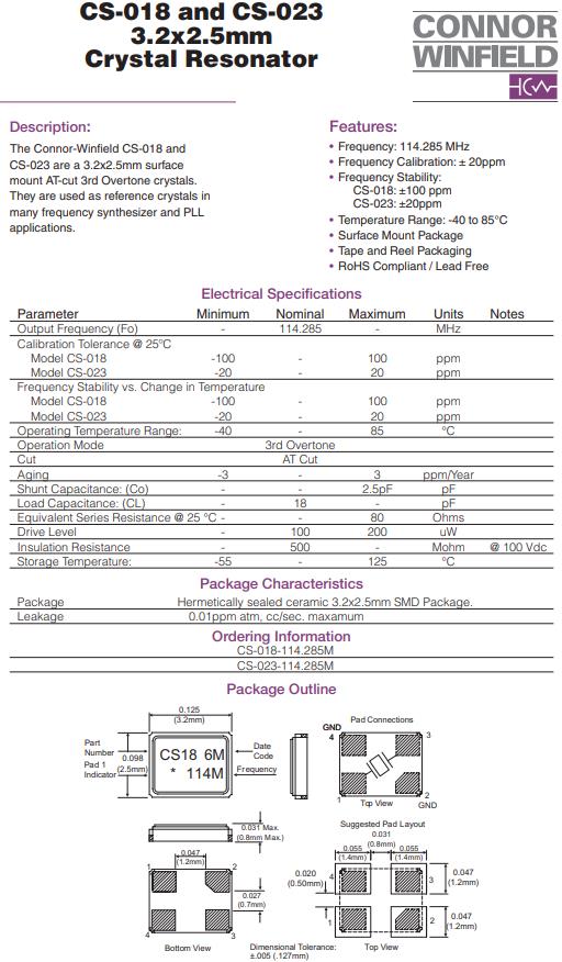 康納溫菲爾德晶振,CS-018晶振,CS-018-114.285M晶振,3225mm體積貼片晶振適用于汽車電子領(lǐng)域的表面貼片型石英晶振,本產(chǎn)品已被確定的高信賴性最適合用于汽車電子部件,晶體在極端嚴(yán)酷的環(huán)境條件下也能發(fā)揮穩(wěn)定的起振特性,晶振本身具有耐熱,耐振,耐沖擊等優(yōu)良的耐環(huán)境特性,滿足無鉛焊接的高溫回流溫度曲線要求,符合AEC-Q200標(biāo)準(zhǔn).Connor-Winfield Corporation 是一家私人控股的美國電子產(chǎn)品制造商。1963 年成立后,Connor-Winfield 主要專注于設(shè)計(jì)和制造用于各種電子應(yīng)用的石英計(jì)時(shí)電路和振蕩器。在 1990 年代,Connor-Winfield 擴(kuò)展到其他產(chǎn)品領(lǐng)域,同時(shí)繼續(xù)關(guān)注其核心計(jì)時(shí)根源。
