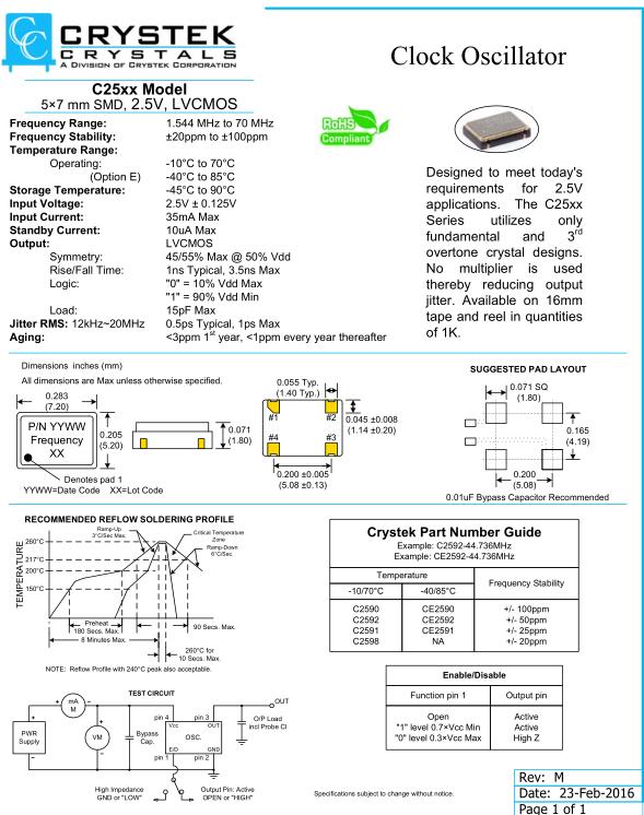 Crystek晶振,C25XX晶振,C1892-44.736MHZ晶振,小型SMD有源晶振,從最初超大體積到現(xiàn)在的7050mm,6035mm,5032mm,3225mm,2520mm體積,有著翻天覆地的改變,體積的變小也使產品帶來了更高的穩(wěn)定性能,接縫密封石英晶體振蕩器,精度高,覆蓋頻率范圍寬的特點,SMD高速自動安裝和高溫回流焊設計,Optionable待機輸出三態(tài)輸出功能,電源電壓范圍:1.8V?5V,高穩(wěn)定性,低抖動,低功耗,主要應用領域:無線通訊,高端智能手機,平板筆記本W(wǎng)LAN,藍牙,數(shù)碼相機,DSL和其他IT產品的晶振應用,三態(tài)功能,PC和LCDM等高端數(shù)碼領域,符合RoHS/無鉛.
