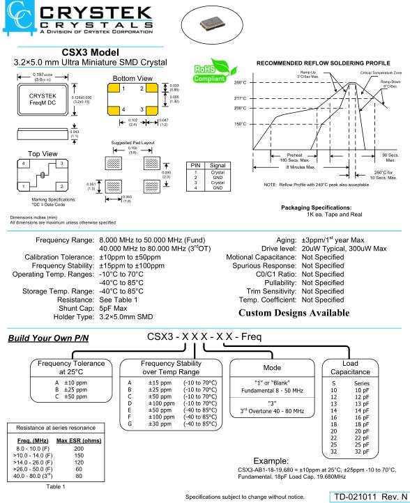 Crystek晶振,CSX3晶振,CSX3AD314-24.000M晶振,小型表面貼片晶振型,是標(biāo)準(zhǔn)的石英晶體振蕩器,適用于寬溫范圍的電子數(shù)碼產(chǎn)品,家電電器及MP3,MP4,播放器,單片機等領(lǐng)域.可對應(yīng)8.000MHz以上的頻率,在電子數(shù)碼產(chǎn)品,以及家電相關(guān)電器領(lǐng)域里面發(fā)揮優(yōu)良的電氣特性,滿足無鉛焊接的回流溫度曲線要求.