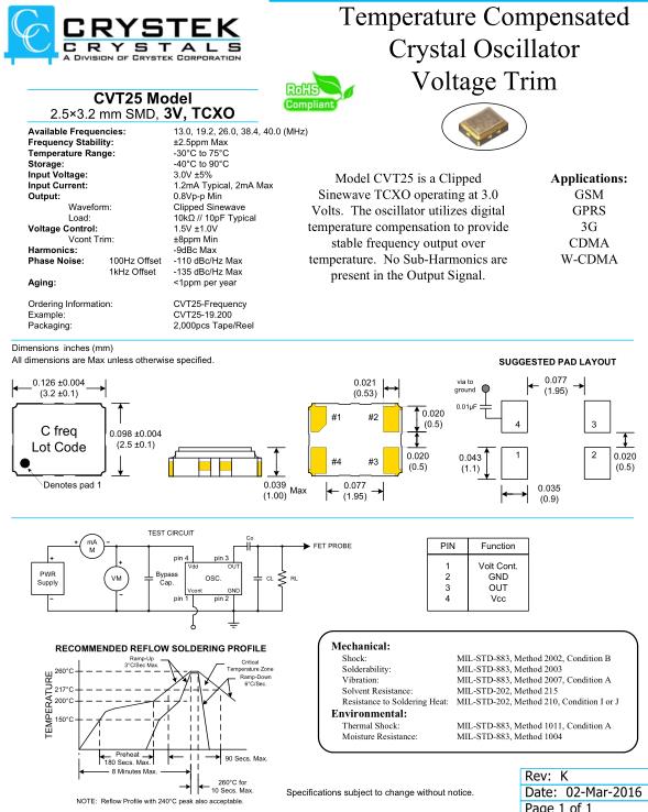 Crystek晶振,CVT25晶振,CVT25-19.200晶振,溫補晶振(TCXO)產品本身具有溫度補償作用,高低溫度穩定性:頻率精度高0.5PPM-2.0PPM,工作溫度范圍:-30度至85度,電源電壓:1.8V-3.3V之間可供選擇,產品本身具有溫度電壓控制功能,世界上最薄的晶振封裝,頻率:26兆赫,33.6兆赫,38.4兆赫,40兆赫,因產品性能穩定,精度高等優勢,被廣泛應用到一些比較高端的數碼通訊產品領域,GPS全球定位系統,智能手機,WiMAX和蜂窩和無線通信等產品,符合RoHS/無鉛.