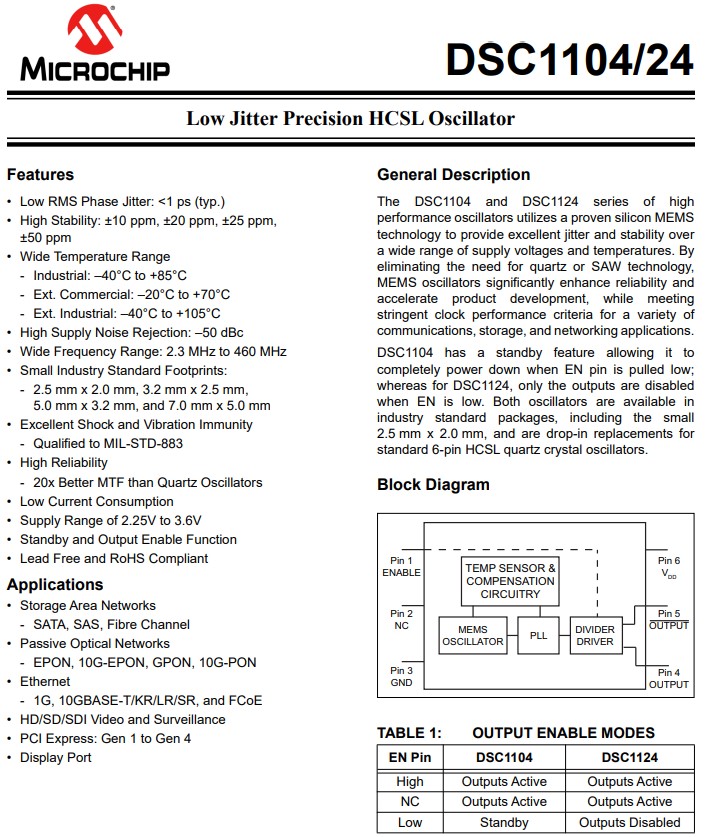 | DSC1104CI5-125.0000T | Microchip晶振 | DSC1104 | 125MHz | 2.25 V ~ 3.6V |