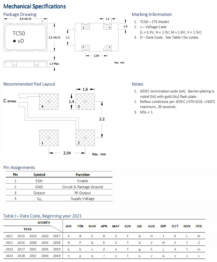 TC50晶振特點:尺寸5.0x3.2x1.3mm貼片晶振,低功耗,最大值為200µA,陶瓷表面安裝封裝,基本水晶設計,+1.8V,+2.5V或+3.3V工作電壓,工作溫度范圍:-40°C到+85°C,