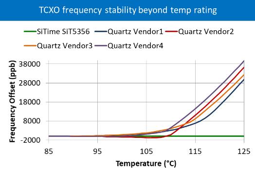 為此,我們推動了各種有源晶振的極限,測量超出額定工作范圍的穩定性.我們測試了額定溫度為+85°C的TCXO器件并將其推至+125°C,并測試了額定溫度為+85°C,最高溫度為+105°C的OCXO.以下圖表顯示了在這些較高溫度下性能下降的結果.在每次測試中,我們將MEMS振蕩器(用綠線表示)與來自不同供應商的石英振蕩器進行比較,所有這些都在同一類別中且具有相同的溫度額定值.為了使比較更容易,每個器件的值在+85°C時從它們的頻率開始,從同一點開始. 上圖顯示了五個工業級TCXO器件在+85°C至+125°C的頻率穩定性