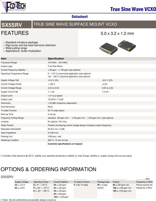 FCD-Tech晶振,SX5SRV晶振,SX5SRV-33F20F4P50-26.000MHz晶振,5032mm體積的石英晶體振蕩器,有源晶振,該產品可驅動2.5V的溫補晶振,壓控晶振,VC-TCXO晶體振蕩器產品,電源電壓的低電耗型,編帶包裝方式,可對應自動高速貼片機自動焊接,及IR回流焊接(無鉛對應),為無鉛產品,超小型,質地輕.產品被廣泛應用到集成電路,程控交換系統,無線發射基站.