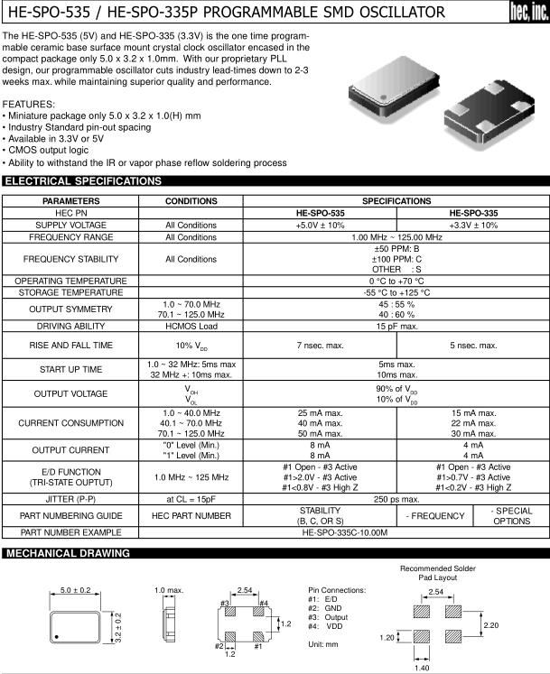 HEC晶振,HE-SPO-535晶振,HE-SPO-535-10.00M晶振,5032mm體積的石英晶體振蕩器,有源晶振,該產品可驅動2.5V的溫補晶振,壓控晶振,VC-TCXO晶體振蕩器產品,電源電壓的低電耗型,編帶包裝方式,可對應自動高速貼片機自動焊接,及IR回流焊接(無鉛對應),為無鉛產品,超小型,質地輕.產品被廣泛應用到集成電路,程控交換系統,無線發射基站.