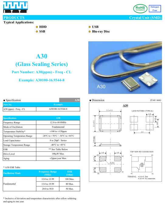 ITTI晶振,A30晶振,A30100-16.9344-8晶振,超小型表面貼片型SMD晶振,最適合使用在汽車電子領域中,也是特別要求高可靠性的引擎控制用CPU的時鐘部分.低頻晶振可從7.98MHz起對應,小型,超薄型具備強防焊裂性,石英晶體在極端嚴酷的環境條件下也能發揮穩定的起振特性,產品本身具有耐熱,耐振,耐撞擊等優良的耐環境特性,滿足無鉛焊接以及高溫回流溫度曲線要求,符合AEC-Q200標準.TTI抱著簡單而創新的宗旨,為各客戶提供優質,經濟的石英電子,更希望成為各位客戶之長遠合作伙伴; 擁有全面,先進之石英晶體,包括, 晶體濾波器(Crystal Filter)、陶瓷諧振器(Ceramic Resonator) 與及其他最先進之晶體振蕩器(Crystal Oscillator)…。等產品。我們擁有可媲美世界一級水平之能力及資源。
