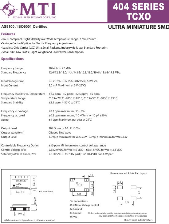 MTI晶振,404晶振,TCXO振蕩器,溫補晶振(TCXO)產(chǎn)品本身具有溫度補償作用,高低溫度穩(wěn)定性:頻率精度高0.5PPM-2.0PPM,工作溫度范圍:-30度至85度,電源電壓:1.8V~3.3V之間可供選擇,產(chǎn)品本身具有溫度電壓控制功能,世界上最薄的晶振封裝,頻率:26兆赫,33.6兆赫,38.4兆赫,40兆赫,因產(chǎn)品性能穩(wěn)定,精度高等優(yōu)勢,被廣泛應用到一些比較高端的數(shù)碼通訊產(chǎn)品領域,GPS全球定位系統(tǒng),智能手機,WiMAX和蜂窩和無線通信等產(chǎn)品,符合RoHS/無鉛.