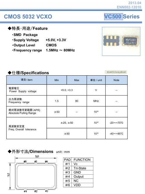 NAKA晶振,VC500晶振,VCXO晶振,5032mm體積的石英晶體振蕩器,有源晶振,該產(chǎn)品可驅(qū)動(dòng)2.5V的溫補(bǔ)晶振,壓控晶振,VC-TCXO晶體振蕩器產(chǎn)品,電源電壓的低電耗型,編帶包裝方式,可對(duì)應(yīng)自動(dòng)高速貼片機(jī)自動(dòng)焊接,及IR回流焊接(無(wú)鉛對(duì)應(yīng)),為無(wú)鉛產(chǎn)品,超小型,質(zhì)地輕.產(chǎn)品被廣泛應(yīng)用到集成電路,程控交換系統(tǒng),無(wú)線(xiàn)發(fā)射基站.納卡晶振公司是使用模擬電路技術(shù),擅長(zhǎng)定制規(guī)格的水晶設(shè)備制造廠(chǎng)。有強(qiáng)烈要求“低相位噪聲、高頻、高信賴(lài)性”的通信設(shè)備、廣播設(shè)備、測(cè)量?jī)x器、交通基礎(chǔ)設(shè)施、醫(yī)療器械、防衛(wèi)設(shè)備。另外,現(xiàn)在已經(jīng)成為問(wèn)題了,對(duì)生產(chǎn)中止,實(shí)現(xiàn)長(zhǎng)期性的產(chǎn)品供應(yīng),以滿(mǎn)足顧客未來(lái)的企業(yè)為目標(biāo)。