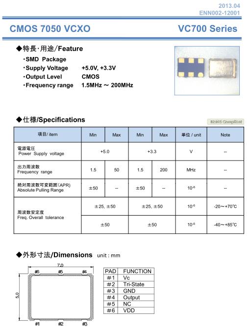 NAKA晶振,VC700晶振,7050mm有源晶振,小型SMD有源晶振,從最初超大體積到現在的7050mm,6035mm,5032mm,3225mm,2520mm體積,有著翻天覆地的改變,體積的變小也使產品帶來了更高的穩定性能,接縫密封石英晶體振蕩器,精度高,覆蓋頻率范圍寬的特點,SMD高速自動安裝和高溫回流焊設計,Optionable待機輸出三態輸出功能,電源電壓范圍:1.8V~5V,高穩定性,低抖動,低功耗,主要應用領域:無線通訊,高端智能手機,平板筆記本WLAN,藍牙,數碼相機,DSL和其他IT產品的晶振應用,三態功能,PC和LCDM等高端數碼領域,符合RoHS/無鉛.納卡晶振公司是使用模擬電路技術,擅長定制規格的水晶設備制造廠。有強烈要求“低相位噪聲、高頻、高信賴性”的通信設備、廣播設備、測量儀器、交通基礎設施、醫療器械、防衛設備。另外,現在已經成為問題了,對生產中止,實現長期性的產品供應,以滿足顧客未來的企業為目標。