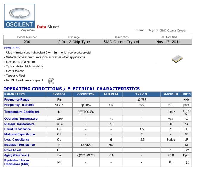 Oscilent晶振,230晶振,230-32.768K-SR-20-W-TR晶振,32.768K時鐘晶體具有小型,薄型,輕型的貼片晶振表面音叉型晶體振蕩器,產品具有優良的耐熱性,耐環境特性,可發揮晶振優良的電氣特性,符合RoHS規定,滿足無鉛焊接的高溫回流溫度曲線要求,金屬外殼的封裝使得產品在封裝時能發揮比陶瓷振蕩器外殼更好的耐沖擊性.Oscilent是全球頻率控制設備制造商,在SAW濾波器,晶體振蕩器,陶瓷諧振器和石英晶體產品類別中提供廣泛的優質產品。請訪問我們的公司頁面,或訪問我們的主要產品頁面,了解我們的標準SAW濾波器,晶體振蕩器,陶瓷諧振器,RF濾波器和石英晶體產品的完整系列。我們屢獲殊榮的設計人員非常樂意評估和測試您的定制要求。