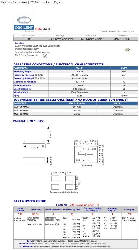 Oscilent晶振,295晶振,295-50.0M-09-30GR-TR晶振