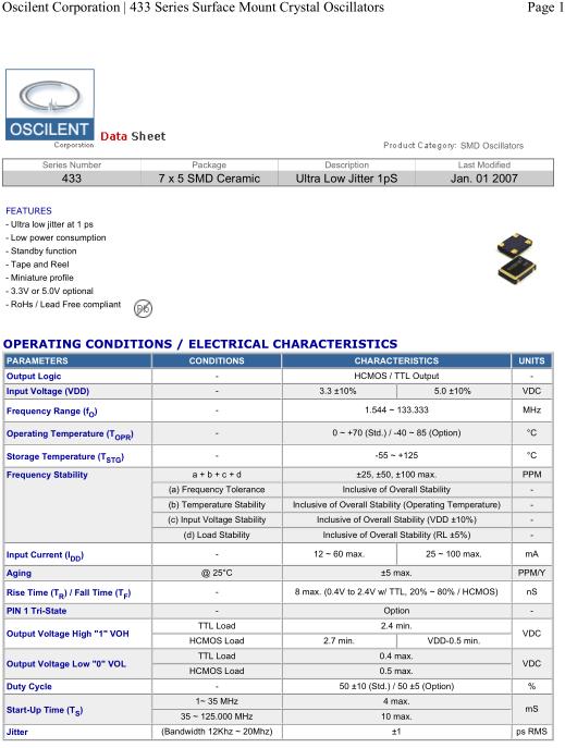 Oscilent晶振,433晶振,433-24.0M-3EN-T-TS晶振,小型SMD有源晶振,從最初超大體積到現(xiàn)在的7050mm,6035mm,5032mm,3225mm,2520mm體積,有著翻天覆地的改變,體積的變小也使產(chǎn)品帶來了更高的穩(wěn)定性能,接縫密封石英晶體振蕩器,精度高,覆蓋頻率范圍寬的特點(diǎn),SMD高速自動安裝和高溫回流焊設(shè)計,Optionable待機(jī)輸出三態(tài)輸出功能,電源電壓范圍:1.8V~5V,高穩(wěn)定性,低抖動,低功耗,主要應(yīng)用領(lǐng)域:無線通訊,高端智能手機(jī),平板筆記本W(wǎng)LAN,藍(lán)牙,數(shù)碼相機(jī),DSL和其他IT產(chǎn)品的晶振應(yīng)用,三態(tài)功能,PC和LCDM等高端數(shù)碼領(lǐng)域,符合RoHS/無鉛.Oscilent晶振公司發(fā)展歷程: