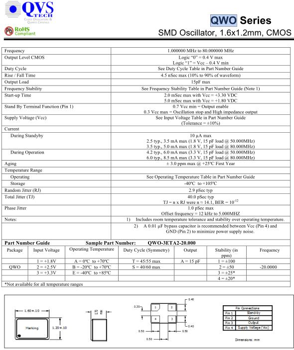 QVS晶振,QWO晶振,QWO-3ETA2-20.000晶振,小型SMD有源晶振,從最初超大體積到現在的7050mm,6035mm,5032mm,3225mm,2520mm體積,有著翻天覆地的改變,體積的變小也使產品帶來了更高的穩定性能,接縫密封石英晶體振蕩器,精度高,覆蓋頻率范圍寬的特點,SMD高速自動安裝和高溫回流焊設計,Optionable待機輸出三態輸出功能,電源電壓范圍:1.8V~5V,高穩定性,低抖動,低功耗,主要應用領域:無線通訊,高端智能手機,平板筆記本WLAN,藍牙,數碼相機,DSL和其他IT產品的晶振應用,三態功能,PC和LCDM等高端數碼領域,符合RoHS/無鉛.QVS TECH INC已成功提供高品質的頻率控制產品超過 15 年。作為位于加利福尼亞州卡爾斯巴德的女性擁有的小型企業總部,QVS TECH INC 以為我們的客戶提供優質服務和快速交貨而享有盛譽。