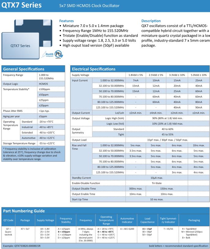 Quarztechnik晶振,QTX7晶振,QTX733B20.0000B15R晶振,小型SMD有源晶振,從最初超大體積到現在的7050mm,6035mm,5032mm,3225mm,2520mm體積,有著翻天覆地的改變,體積的變小也使產品帶來了更高的穩定性能,接縫密封石英晶體振蕩器,精度高,覆蓋頻率范圍寬的特點,SMD高速自動安裝和高溫回流焊設計,Optionable待機輸出三態輸出功能,電源電壓范圍:1.8V~5V,高穩定性,低抖動,低功耗,主要應用領域:無線通訊,高端智能手機,平板筆記本WLAN,藍牙,數碼相機,DSL和其他IT產品的晶振應用,三態功能,PC和LCDM等高端數碼領域,符合RoHS/無鉛.Quarztechnik晶振公司作為德國振蕩石英晶體和振蕩器制造商已有50多年的歷史,我們生產各種產品 - 從通道晶體,振蕩石英晶體和石英振蕩器到基于壓電單晶的傳感器元件。我們的產品應用于所有類型的無線電應用,如用于制造振蕩器和壓力,溫度和質量敏感傳感器元件的精密晶體。