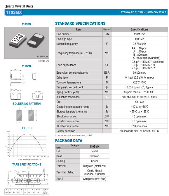 SMI晶振,110SMX晶振,超小型晶振,貼片表晶32.768K系列具有超小型,薄型,質地輕的表面貼片音叉型石英晶體振蕩器,晶振產品本身具備優良的耐熱性,耐環境特性,在辦公自動化,家電領域,移動通信領域可發揮優良的電氣特性,符合無鉛標準,滿足無鉛焊接的回流溫度曲線要求,金屬外殼的石英晶振使得產品在封裝時能發揮比陶瓷晶振外殼更好的耐沖擊性能.SMI晶振公司電子社會做出貢獻,在穩步的研究和努力的基礎上,快速開發先進的水晶產品。