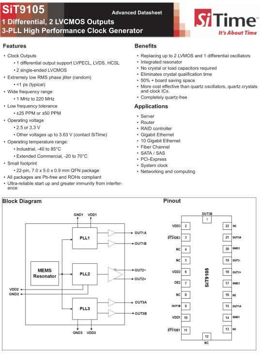 SiTime晶振的可配置解決方案幫助客戶提高產品性能,縮小產品尺寸,提升產品可靠性,并在市場競爭中脫穎而出。SiTime產品采用標準半導體制造工藝和高量產塑料封裝技術的生產流程,提供業界強大的供貨能力和簡短的交貨時間.并且SiTime晶振向市場供應優質的有源晶振,可編程振蕩器等產品.SiTime晶振,SiT9105晶振,高性能晶振.