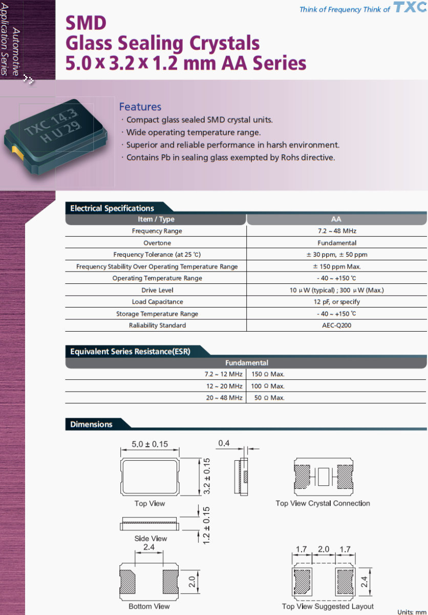 TXC陶瓷晶振,車載香薰系統晶振,AA-8.192MAGE-T二腳晶振,臺灣TXC晶振公司,晶技晶振,無源晶振,5032晶振,AA-8.192MAGE-T晶振,汽車晶振,汽車電動天窗控制系統晶振,臺灣晶振,貼片晶振,二腳晶振,石英晶振,高品質晶振,車載多媒體晶振,行車記錄儀晶振,低損耗晶振,耐高溫晶振,耐沖擊晶振AA系列SMD,玻璃密封晶體,5.0 x 3.2 x 1.2 mm ,功能。緊湊的玻璃密封SMD晶體單元。工作溫度范圍廣。在惡劣環境下性能優越可靠。不受Rohs指令限制的密封玻璃含鉛。