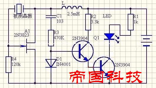 晶振檢驗電路,2N3823結型N溝道效場應管(可用任何型其它型號的同類小功率場效應管,如 3DJ6、3DJ7等)于被測晶體(晶振、石英晶振、32.768K、表晶)等組成一個振蕩器,兩個兩個NPN三極管2N3904(也可用任何型號其它小功率NPN三極管)接成復合檢波放大器,驅動發光二極管LED,若被測晶振良好時,振蕩器起振,其震蕩信號經0.01uF的電容藕合至檢波放大器的輸入端,經放大后驅動發光二極管發光,如果被檢晶振不好,則晶振不起振,發光二極管就不發光。