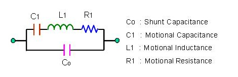 (圖一)(a)及(b)分別是DIP型式及SMD型式的石英振蕩子的基本結構圖. (圖七)(c)是電子電路上所使用代表石英振蕩子的電子符號. 當石英晶體共振子處在遠離振蕩頻率區域時, 石英晶體共振子僅是一個電容性的組件, 當頻率接近石英晶體的振蕩頻率時, 就接近是一個電感性的等效LCR振蕩線路.