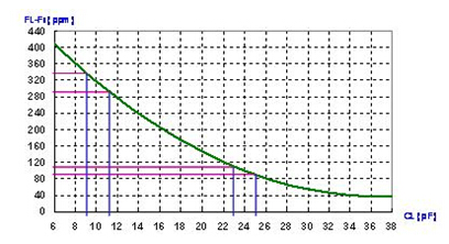 在(圖)中, CL=24 pF 時的頻率敏感度是10 ppm/pF, 及CL=10 pF時的頻率敏感度是20 ppm/pF. 在并聯線路中, 負載電容越小, 頻率對負載電容變化的敏感度越高. 相反的, 負載電容越大, 頻率對負載電容變化的敏感度越低. 這就是石英晶體共振子用于VCXO線路上時, 線路設計上會選用較小負載電容. 反之, 在要求較準確的頻率信號時, 線路設計上會選用較高的負載電容.
