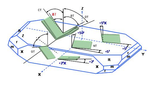 依據不同的應用領域及工作溫度需求, 因應了許多不同的石英切割角度種類. 例如AT-, BT-, CT-, DT-, NT, GT…..等不同的切割板片. 不同的切割方向的板片具有不同的彈性常數張量(elastic constant tensor), 不同的壓電常數張量(piezoelectric constant tensor)及不同的介電常數張量(dielectric constant tensor). 這些張量在石英組件的設計及應用上展現了不同的振蕩及溫度特性. (圖)表現了在Z-plat石英結構上,幾種不同方向的石英板片切割方式.