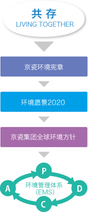 京瓷集團在“共存(LIVING TOGETHER)”這一理念的指導下,為構建低碳社會、循環(huán)型社會、與自然共存的社會,制定了《京瓷環(huán)境憲章》,其中規(guī)定了環(huán)保產(chǎn)品開發(fā)、節(jié)能、防止全球變暖、節(jié)約資源、削減廢棄物、化學物質(zhì)的合理管理、保護生物多樣性等綜合性的環(huán)保措施.