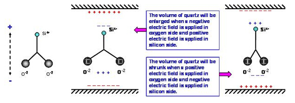 石英材料中的二氧化硅分子(SiO2) 在正常狀態下, 其電偶極是互相平衡的電中性. 在(圖二左)的二氧化硅是以二維空間的簡化圖形. 當我們在硅原子上方及氧原子下方分別給予正電場及負電場時, 空間系統為了維持電位平衡, 兩個氧原子會相互排斥, 在氧原子下方形成一個感應正電場區域, 同時在硅原子上方產生感應負電場區域. 相反的情況, 當我們在硅原子上方及氧原子下方分別給予負電場及正電場時, 兩個氧原子會相互靠近, 氧原子下方產生感應負電場,硅原子上方產生感應正電場. (圖二). 然而, 氧原子的水平位置變化時, 鄰近的另一個氧原子會相對的產生排斥或吸引的力量, 迫使氧原子回到原來的空間位置. 因此, 電場的力量與原子之間的力量會相互牽動, 電場的改變與水平方向的形變是形成交互作用狀態. 這個交互作用會形成一個在石英材料耗能最小的振動狀態, 祇要由電場持續給與能量, 石英材料就會與電場之間維持一個共振的頻率. 這個壓電效應下氧原子的振幅與電場強度及電場對二氧化硅的向量角度有相對應的關系.在實際的應用上, 電場是由鍍在石英芯片上的金屬電極產生, 電場與二氧化硅的向量角度則是由石英晶棒的切割角度來決定.