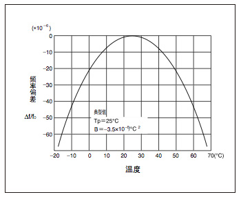 音叉型石英晶振的頻率溫度特性如左側(cè)的曲線圖所示,顯示了以+25°C為頂點(diǎn)的負(fù)向2次方程曲線. 溫度范圍越寬,則頻率的變化量也越大,因此,需要 考慮一下所使用環(huán)境的溫度范圍和必要的精度.[頻率溫度特性的近似公式]